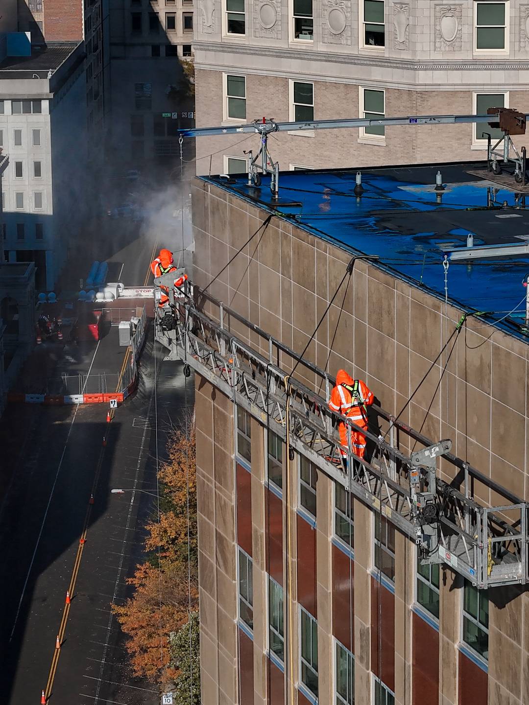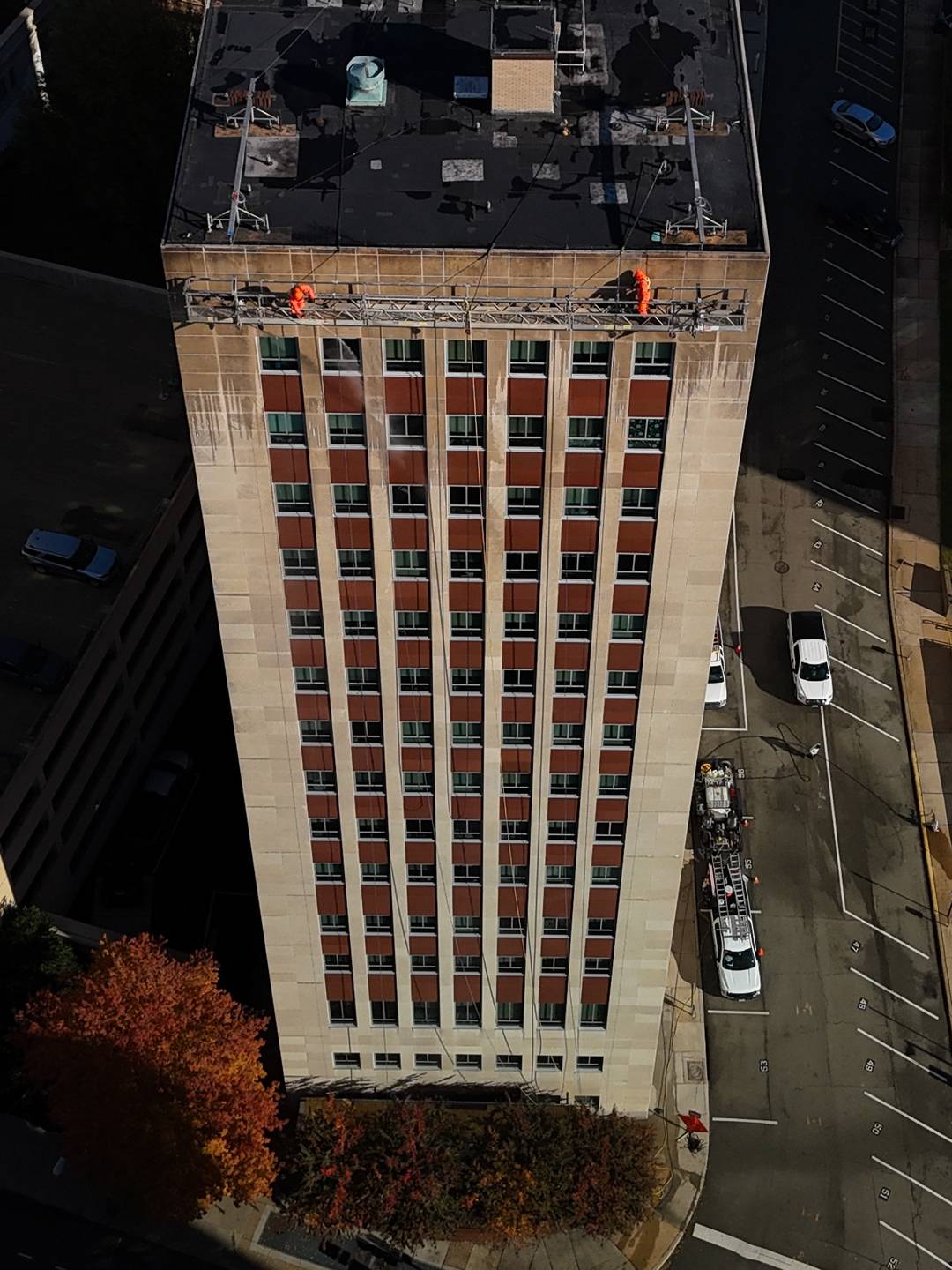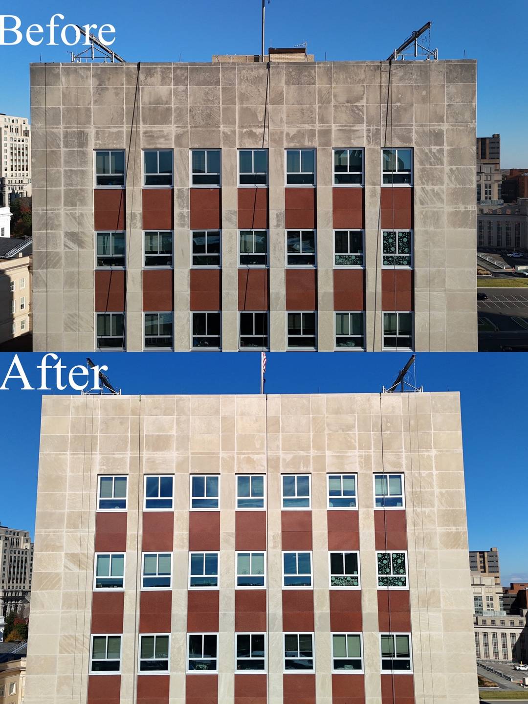 Working from top to bottom, we removed buildup that had dulled the stone and darkened the surface. The difference is clear in the before and after photos. The lighter tone of the stone now stands out again, and the building’s details are much more visible. The refreshed look blends seamlessly with the surrounding skyline and restores the bright, clean appearance the Jefferson Building is known for. Projects like this require a careful approach, steady coordination, and the right equipment, especially in a busy downtown area. If you’re planning an exterior project, contact Envirowash. Our team can take it from here—the skyline’s the limit!
